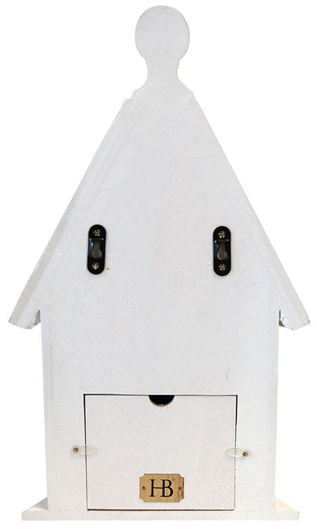 Enchant the avian visitors to your bird garden by placing this Home Bazaar Rapunzel Bird House in it. An extended, shingled roof, top finial, and half hexagonal body perfectly evoke a castle turret, while forming a charming shelter for a small songbird. The flat back and dual keyhole hangers make it simple to place this home against a wall, fence, or post, and the front half arches outward to create a cozy abode. A curved balcony and 1.25" diameter entry hole rest on the front panel, enabling birds to enter and providing them a preening spot, while scrolling adornments above the opening add style. Matching scrolls on each side panel further the elegant look, completed by the white paint. Tan and brown shingles atop the roof provide fantastic texture and protect the interior chamber from the elements, and a drainage hole on the base allows any captured water to exit the nest. A panel on the flat back removes for cleaning and nest checks, and a screen beneath the entry acts as a ladder for nestlings to exit when ready. The all wood construction and striking details are sure to capture attention, and the flat back makes mounting simple. Create a storybook look in your bird garden with this Rapunzel Bird House.