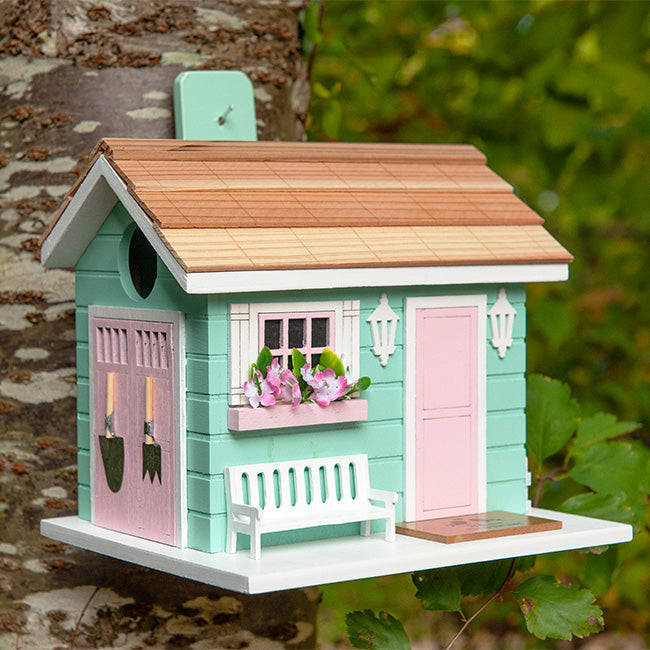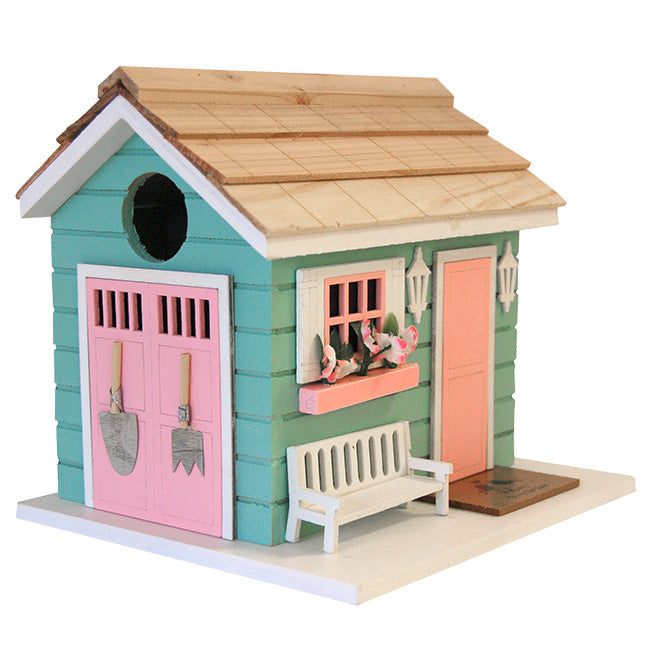 Add a feminine hint and fun motif to your backyard bird garden with this Home Bazaar She Shed Bird House. The traditional, rectangular shape of this home offers a classic roosting spot, while its pastel color scheme and unique accents add a bit of whimsy. Detailing such as a bench, garden tools, and welcome mat bring visual interest to the piece, and the pitched, lapped roof completes the item. Its light green body meshes with your landscaping, while pink doors, window panes, and a flower box offer a bit of contrast. The white, level base, trim, bench, and sconce shapes add realism to the item, while miniature garden tools on one side capture attention. Birds can readily enter the home through the 1.25" diameter opening on one side of the piece, which leads to the generous interior. The roof protects this nesting area from rain, and a hole on the base provides drainage. A ventilation gap runs along the front of the home, cleverly placed beneath the roof overhang, aiding in regulating the internal temperature. Remove the back panel of this unit to check the nest or clean the item, and place it against a wall or post with the attached mounting tab. For a different look, place the level base on a pole or post using a mounting bracket (not included). The wooden body celebrates the natural world, while the soft tones bring a lively hint to the home. Turn a bit of your bird garden into a ladies' retreat by adding this She Shed Bird House to it.