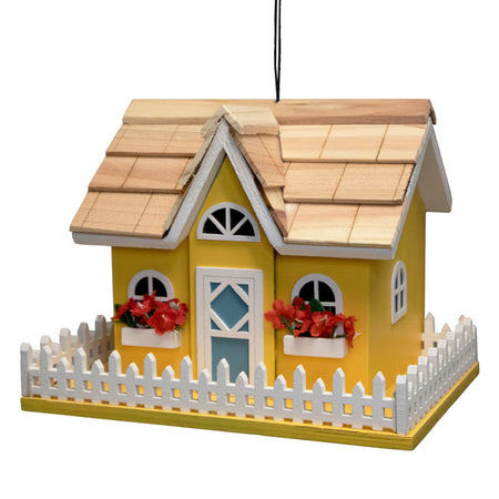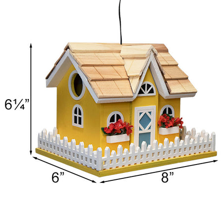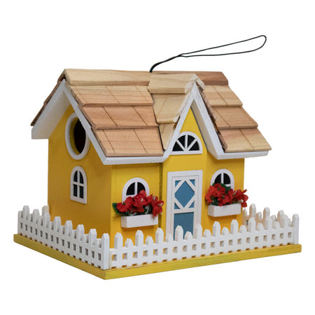 Bring elegant style and charming allure to your bird garden and give feathered friends a cozy house in your backyard with the Home Bazaar Yellow Snuggle Inn Bird House. The crisp, striking yellow tone of this rustic house and surrounding base lends an elegant look in your yard, while the bright white hue of the familiar picket fence matches the trim of the windows and door to lend a sophisticated and elegant splash of colorful contrast to the piece. Vibrant red, faux flowers spill out of planter boxes just below the front windows of the dwelling for maximum flair, and the soft, blue tone of the door stands out beautifully within the white border. A semicircular window rests beneath the gable, just above the shelter's front door, and a 1.25" diameter entryway is situated on one of the domicile's side panels to encourage easy access for a variety of songbirds. A quaint, wood shingled roof covers the durable and timeless house, with a wire loop situated atop the abode to give you an easy method for displaying it from a branch or hook. Alternate mounting is possible when you use a mounting plate (not included) to showcase the habitat atop a 4 x 4 post for an elevated and eye-catching display. The shelter's base sports four holes to facilitate healthy drainage of captured moisture. A 4" x 2.75" panel on the house's rear panel can be removed easily for maintenance and cleaning, while gaps where the front wall and roof meet create superior, convenient ventilation to help maintain a clean and fresh nest for songbirds. Create a peaceful and memorable focal point in your birding sanctuary and give feathered friends a blissful retreat with this Yellow Snuggle Inn Bird House.
