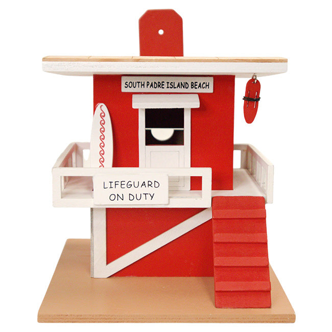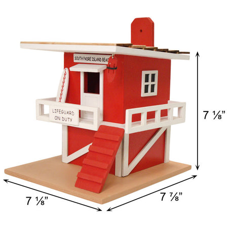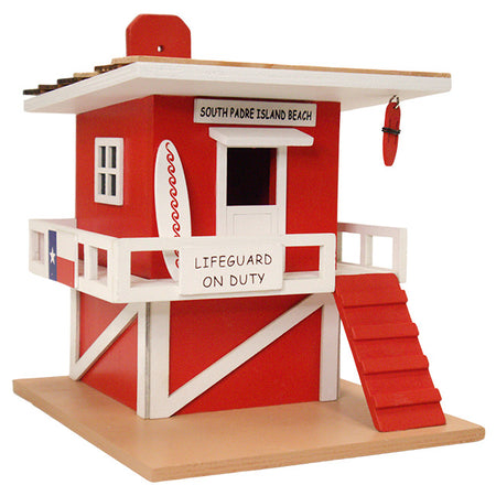 Celebrate nautical beauty with Texas charm as you welcome songbirds to your backyard with this amazing Home Bazaar South Padre Island Lifeguard Shack with Texas Flag. This hardy, decorative domicile features paraphernalia and embellishments that provide birds with adequate housing while reminding you of South Padre Island Beach and scenic, seaside beauty. This two story dwelling sports wooden shingles for realism and natural charm, and the vibrant, red tone of the shack lends outstanding coloration and beachside appeal. A Texas flag adorns the railing of the unit to call attention to the fantastic heritage of the "Lonestar State", while miniature surfboard and life preserver figures hang from the wall and ceiling of the upper level to round out the lifeguard theme. The all-white railing pairs with white windows and doors to create fantastic contrast against the bright red hue of the walls, and a sloped, red ladder connects the spacious, tan base of the unit to the upper level for eye-catching realism and enchantment. The 1.25" square entrance hole on the shack's front accommodates a wealth of smaller songbirds, such as wrens and finches, as they flock to this scenic home for a safe and reliable shelter. A hole in the base helps maintain a clean and dry shelter, and the tall structure allows warm air to exit through the opening, and the back panel may be removed in moments to carry out cleanings and nest checks. An attached hanging paddle lets you easily showcase this striking, durable home, or the flat base may be mounted to a post for variable display using a mounting bracket (not included). Create a stunning display of state pride with a nod to beachside wonder while housing birds with this South Padre Island Lifeguard Shack with Texas Flag.
