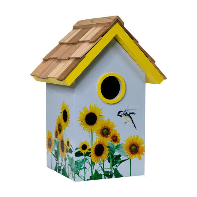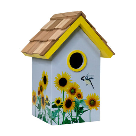 Transform your backyard bird garden into an elegant and floral locale for feathered friends with this charming Home Bazaar Sunflower Print Standard Bird Cottage. The pristine, delightful shelter sports a light blue color for lovely and delicate allure, while sunflowers along the front and side panels provide contrast and a splash of additional color. A charming bird rendering hovers above the sunflowers on the front of the home to create an entertaining portrait, while the 1.375" diameter entrance and pitched, wood shingled roof are bordered with vivid yellow to create an alluring embellishment in your bird garden. A metal keyhole bracket on the home's rear lets you easily mount the domicile against a post or wall, or employ a mounting bracket (not included) to showcase the home atop a pole or post for a different look. The 4.75" x 4.5", rectangular base of this colorful, floral abode features a pair of holes to encourage drainage of accumulated moisture, and gaps beneath the roof overhang help with ventilation to ensure a fresh roost for feathered inhabitants. A 4.25" x 3.75" rear panel may be unscrewed to gain easy access to the nesting chamber when nest checks and cleanings are needed, and a mesh ladder inside the shelter rests just below the entrance, offering fledglings an easy grip as they try to exit the dwelling. Staunch wooden construction lends durable and lasting quality to the piece, letting nearby birds enjoy this rustic and alluring nesting site as it graces your luxurious bird garden. Spotlight glorious sunflowers and beautiful, vibrant tones in your backyard space while harboring feathered friends with the Sunflower Print Standard Bird Cottage.