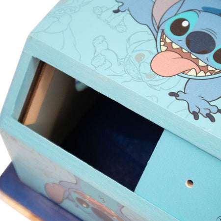 - Striking imagery of lovable Stitch adorns three sides of this enchanting blue, wooden shelter