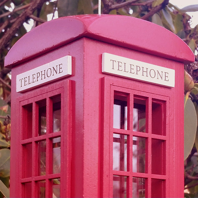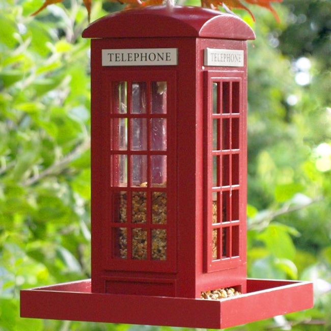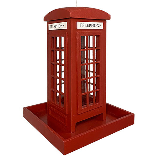 Display a taste of British culture in your yard or garden with this Home Bazaar Telephone Booth Bird Feeder. The rectangular box shape and bold red color of the feeder perfectly mimic the iconic telephone booth so prevalent in Britain, adding brilliance to any surrounding greenery. The telephone booth forms the seed reservoir and holds 0.5 quarts of seed, while a generous base platform provides plenty of perching and dining space. Seed from the reservoir easily exits through two gaps at its base for continual feeding, and transparent windows all around make for easily keeping a watchful eye on seed levels from a distance. The cap of the feeder lifts for simple cleaning and refilling the reservoir, and a hardy cable attached to it makes for straightforward hanging. The wooden construction and red color of the feeder offer durability and a bolder aesthetic to your outdoor space. Bring a familiar and nostalgic look to your bird garden with this Telephone Booth Bird Feeder.