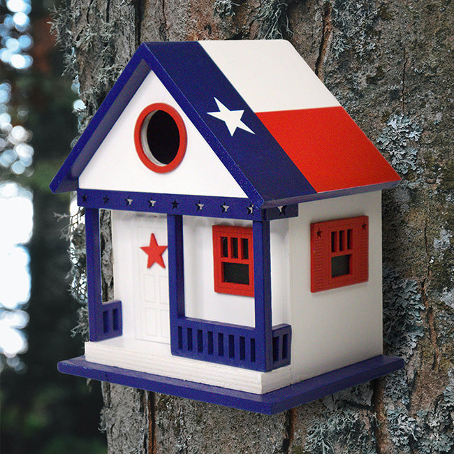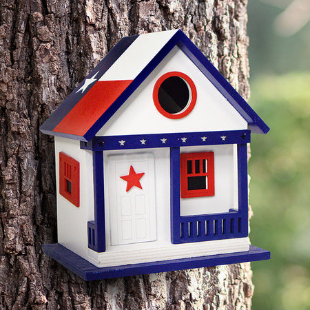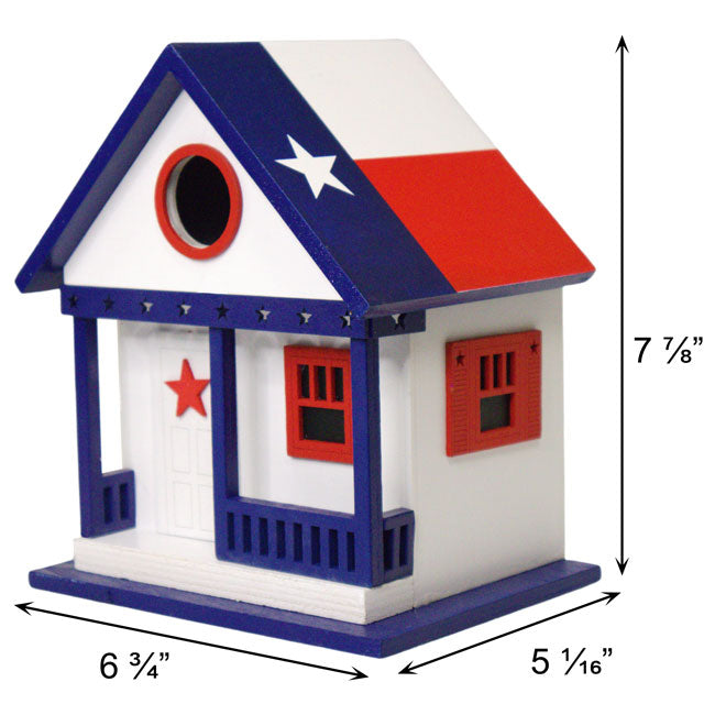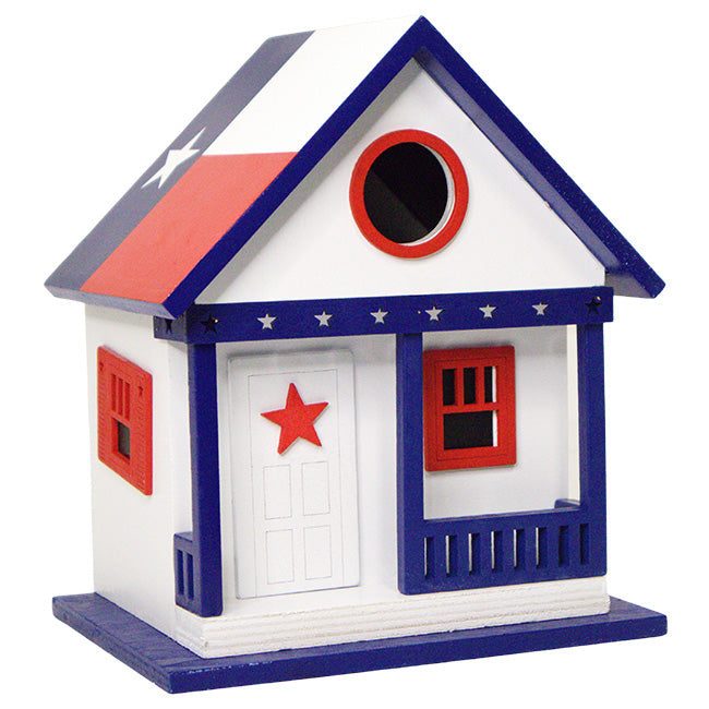 Combine beautiful, colorful design with state pride while housing songbirds with this Home Bazaar Texas State Cottage Bird House. The charming decoration of this house pays homage to the great state of Texas, with red, white, and blue tones in the style of the state flag adorning the robust shelter. Three faux windows, a front door, and a porch rail add stunning realism to the cottage, while the flag pattern covers the pitched roof for a wonderful embellishment. Star-shaped cut outs accentuate the blue trim and red shutters, along with an ample red star on the front door, brilliantly drawing attention to the domicile. A 1.25" diameter entry hole is trimmed in red above to lend a unique and fitting style. This allows small songbirds to enter the unit, and the generous interior provides plenty of nesting area for a cozy roost. A drainage hole on the level base helps facilitate proper drainage, while gaps beneath the roof overhang offer superior ventilation. This stout unit's back panel removes easily for nest checks and cleaning, and a metal bracket allows you to place the dwelling against a post or wall for a great showcase. The base may also be pole mounted using an adapter for a different display. The navy, white, and red paint will lend dazzling, Texas tones to your garden as a variety of feathered friends flock to this unique and wonderful shelter. Highlight your love of the Lonestar State and attract a bevy of birds with the Texas State Cottage Bird House.