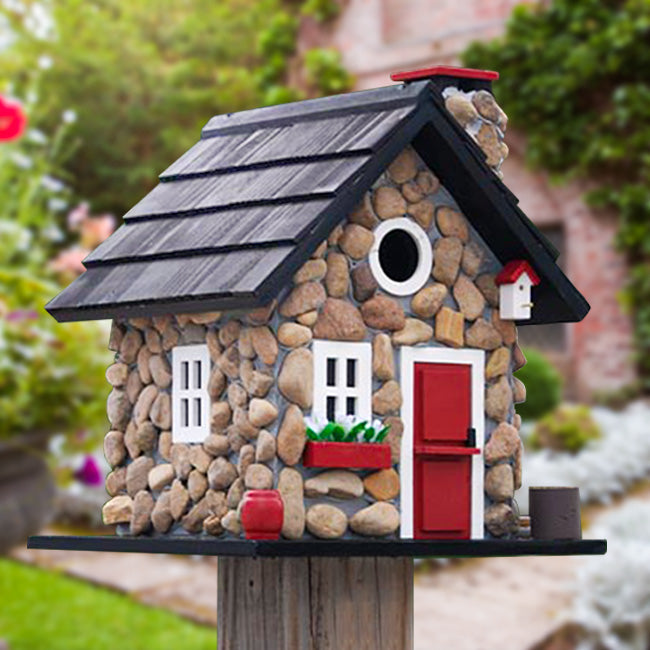 Create an enchanted feel in your bird garden with the Home Bazaar Windy Ridge Stone Bird House. Blending style with realistic details, this cottage will certainly bring a charming touch to your home or backyard in moments. The stone covered façade lends a rustic feel to the piece, furthered by the faux wood pile, bird house, and window box with fabric flowers. A 1.25" diameter entry hole sits at the top of the unit, allowing wrens and chickadees to roost in it. The pitched roof protects the entry from rain, and its wooden shingles and black color add drama. Ventilation slots run beneath the roof overhang on the sides of the shelter, helping maintain a proper internal temperature. The spacious interior provides room for an entire avian family, and screening beneath the entry hole allows fledglings to reach it easily when ready to exit the home. Use the included mounting plate to display this unit on a 4 x 4 wooden post (not included), or hang it using the included hardware. The wooden and stone body is perfect for use indoors or outside, and the amazing details will certainly capture attention. Add a magical look to your bird sanctuary with this Windy Ridge Stone Bird House.