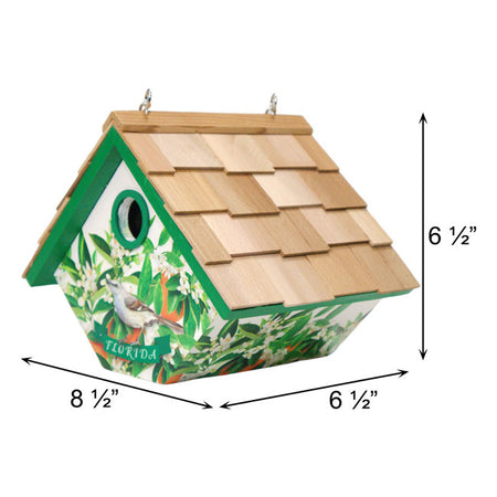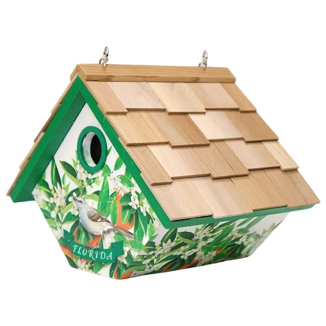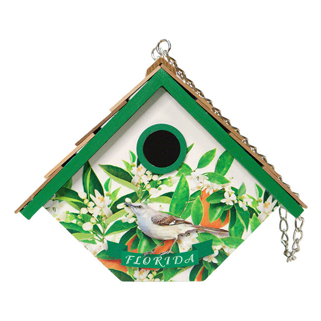 Pay homage to the great state of Florida while establishing a charming and natural focal point in your bird garden with this Home Bazaar Orange Blossom Print Wren House for Florida. Artwork depicting oranges and lush, leafy surroundings pair with a mockingbird figure to decorate this simple home's front and sides, while a green ribbon design reading "Florida" acts as a centerpiece on the front of the habitat. A 1.125" diameter entrance and pitched, wood-shingled roof cover the dwelling for a dash of natural charm, and the vibrant, green trim beneath the roof and around the entrance hole lends colorful contrast to the unit. The diamond-shaped shelter gives wrens a fantastic place to roost, as these diminutive birds tolerate a home that may sway when hung, and the roof's attached, metal chain provides a simple and handy method for displaying this loving nod to Florida sunshine in your outdoor sanctuary. Alternatively, the rear of the home features a convenient keyhole bracket to let you showcase this abode against a post or tree using a single screw. Holes in the house's bottom facilitate superior drainage to get rid of excess moisture, and gaps between the panels and roof encourage fresh air flow, giving wrens a pleasant and enjoyable shelter. Easily unscrew the base, sliding it out from the shelter to access the home and to ensure that your feathered friends continue to enjoy a clean roost. Proudly declare your love for the state of Florida and harbor wrens in your bird garden with this Orange Blossom Print Wren House for Florida.