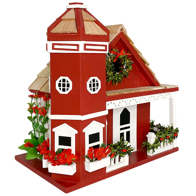 Offer nearby songbirds a holiday decorated roost with the Home Bazaar Yuletide Red Cottage Bird House. This red house with white trim and a wood shingled roof makes for a striking addition to your home or garden. Imitation garland along the wraparound porch railings and a wreath around the 1.25" diameter entrance create a decorative holiday home, perfect for use outdoors with local birds or simply as seasonal decor. Flower boxes adorned with faux red blooms enhance the home's three imitation bay windows, and a white garden trellis near the rear of the house is lined with faux greenery and flowers, making for a well-landscaped and seasonally colored space for any feathered residents. Its 8.75" wide and 5.75" deep, flat base makes for straightforward mounting atop a post with a mounting bracket (not included), while a swiveling plank on the rear of the structure offers simple placement against a post or wall. The rear also features a removable 5.5" x 3.75" panel for routine cleanings, and two small holes in the base create adequate drainage for any accumulating moisture. This ornate home's intricate design offers a sight to be enjoyed by you and your birds alike. Infuse your garden or home with a seasonal touch using this Yuletide Red Cottage Bird House.