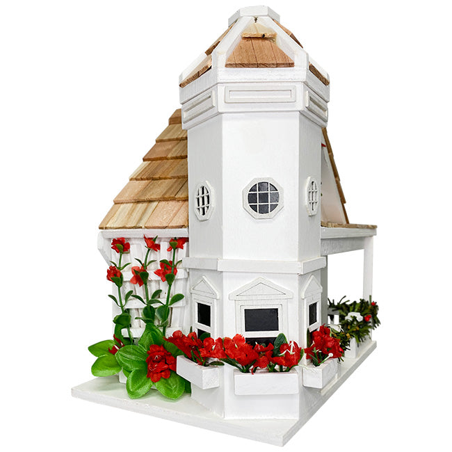 Offer songbirds a deluxe new roost this winter by adding this Home Bazaar White Yuletide Cottage Bird House to your yard. Reminiscent of homes on the eastern seaboard, this detailed unit will certainly bring a festive hint to any setting. A side turret and wraparound porch capture the classic theme, while the white color adds a timeless look. Faux windows along the turret and bottom floor, combined with wooden shingles on each roof, further the realism. Fabric flowers on the trellis and within the window boxes bring the familiar, red and green color scheme to the forefront, perfectly contrasting the white home. Additional, green garland around the porch rail has red bulb shapes throughout it, and dual bells hang from the soffit for added adornment. A fabric wreath surrounds the 1.25" diameter entry hole, which allows smaller birds to enter the shelter. Screening beneath this opening inside the box enables fledglings to climb upward and exit the unit when ready, and the significant back panel removes for nest checks and maintenance. Dual drainage holes on the base help nestlings remain dry, while ventilation slits on the shorter sides prevent overheating. Place this detailed home on a wall or post with its attached hanging tab, or attach a mounting plate (not included) to its base for a different look. Integrate holiday décor into your bird garden with this White Yuletide Cottage Bird House.