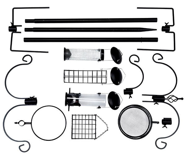 Create a vivacious gathering spot for feathered friends in your garden using this Jester Premium Bird Feeding Station with Feeders kit. This thorough package provides a variety of feeder options for birds in a minimal amount of space, while the four hangers on the top assembly evoke a jester's cap for a whimsical hint. Four included, hanging feeders are simple to suspend from these arms, and each holds a different food to invite a variety of birds to dine. The plastic reservoir of the tube style feeder accommodates mixed or solid seed, while the 0.25" square mesh tube forms a classic peanut feeder. An additional mesh feeder with larger, rectangular grid holds suet balls, and a suet cage completes the bundle. Dual, metal rings slide easily onto the central, metal shaft, made to hold the included plastic dish and micro mesh tray. The dish works wonderfully as a compact bird bath, while the tray can hold fruit or mealworms to delight orioles and bluebirds. Complete the station by placing the shorter, 7" long arm lower on the shaft to hold a thistle sock or other small accessory. The pole's pointed base inserts into garden soil, while four step-in feet form a robust anchor. The pieces assemble without hardware thanks to swaged pole ends, slip fit joints, and thumbscrews for tightening, and the black, powder coated finish deters rust and wear. The fantastic height makes this station a focal point in your landscaping, while its compact design is a boon for smaller yards. Offer birds a new buffet in your backyard using this Jester Premium Bird Feeding Station with Feeders. Assembly required.