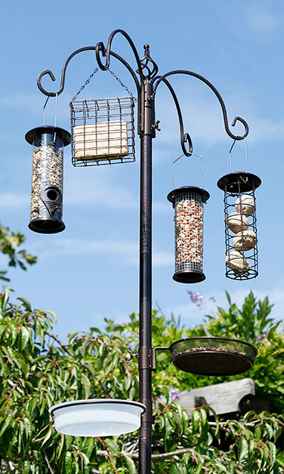 Add a jovial avian hot spot to your garden with this Jester Premium Brown Bird Feeding Station with Feeders bundle. This package not only lends a whimsical look to your garden; it also provides a fantastic variety of feeders within a minimal amount of space. The four, significantly arched top hangers mimic a traditional jester's hat, and each culminates in an outward curl for holding one of the included feeders. The plastic seed tube is great for mixed feed, while the mesh tube holds peanut chunks or large sunflower seeds with ease. A rectangular gridded reservoir accommodates suet balls, and the square feeder handily holds a standard suet or seed cake. This provides birds a variety of dining options, while the tubular metal pole creates a hardy support. A clear, plastic dish nestles into one ring, acting as a bath or waterer, and a micro mesh bowl sits in the other and accommodates fruit, mealworms, or other seed. Complete the station by placing the shorter, 7" long arm lower on the shaft to hold a thistle sock or other small accessory. The pole's pointed base inserts into garden soil, while four step-in feet form a robust anchor. The pieces assemble without hardware thanks to swaged pole ends, slip fit joints, and thumbscrews for tightening, and the dark brown coating and hammered finish enhance your outdoor surroundings. Its significant height keeps birding activities visible, while the compact footprint is great for use in a smaller yard. Make a corner of your garden into a birding sanctuary with this Jester Premium Brown Bird Feeding Station with Feeders. Assembly required.