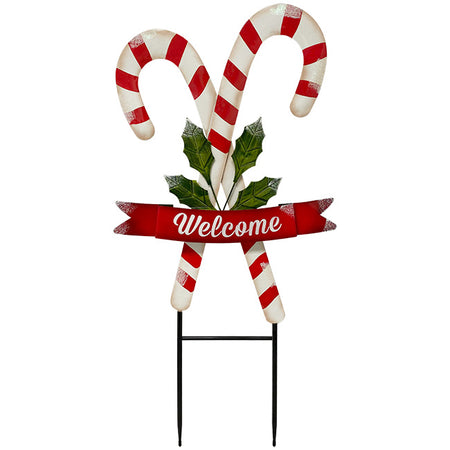 Bring some minty style to your landscaping with this Land and Sea Metal Candy Cane Staked Yard Art. Two crossed red-and-white candy cane figures are adorned with four frosty green holly sprigs and a delightful dusting of glitter to lend them a snowy feel. The word "Welcome" is written in white paint and rests on a red ribbon shape, bolstering the yuletide feeling. Elevated by two 11" metal stakes, the raised candy canes create a sense of height that is sure to be the talk of the season. The stakes are supported by a horizontal metal rod to add extra stability, and the stakes are pointed, allowing for easy installation into soil. The piece is constructed from durable metal which ensures it can endure elemental wear for many seasons. The "Welcome" sign is removable for an interesting alternative look. Turn your yard into a wintery wonderland by adding this exciting Metal Candy Cane Staked Yard Art to it.