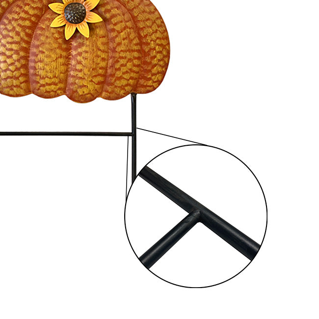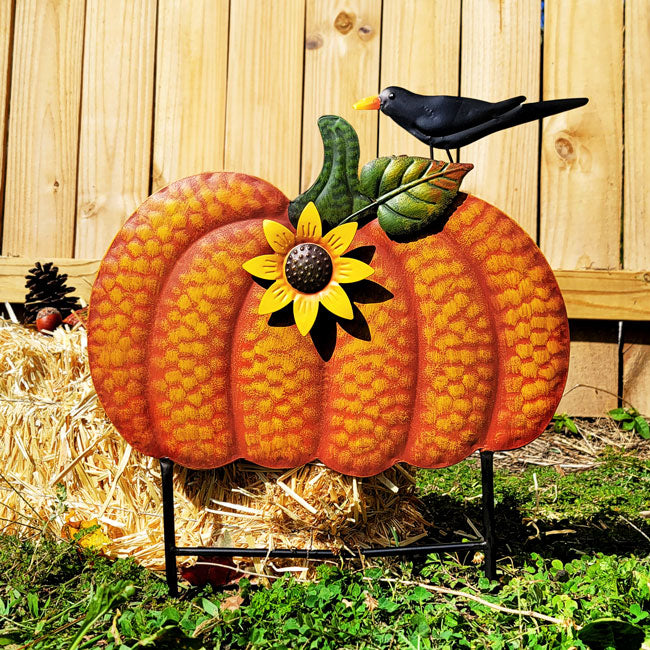 Add "gourd"-geous shape to your flowerbed or along your garden walkway using this Land and Sea Metal Pumpkin with Sunflower and Bird Yard Art. A wide and traditional pumpkin figure creates the main part of this sculpture, complete with impressed curving lines, a green stem, and three-dimensional leaf. A black raven sits atop the pumpkin, with a white eye and bright yellow beak offering an intense expression, while a familiar sunflower near the pumpkin stem completes the unit. The outwardly curved seed disc and emanating yellow petals here lend even more depth and dimension to the artwork, easily enhancing the varied orange hues on the pumpkin. Two, 10.75" legs sport pointed ends for easy installation in your soil, and a horizontal rod between these legs offers support. The painted metal body withstands exposure to the elements, remaining durable for several seasons of service, and the adorable motif is perfect for spring, summer, and fall display. Accent your yard or flowerbed with charming and familiar sculpture using this Metal Pumpkin with Sunflower and Bird Yard Art.