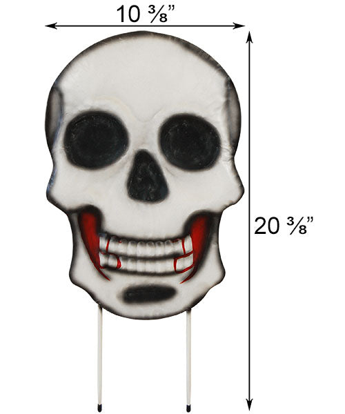 Lend a macabre hint to your yard this Halloween with this Land and Sea Metal Skull Yard Art. Adding this detailed piece to your lawn quickly creates a frightening motif, from its realistic eye and nose openings to the red around the teeth. Raised and impressed elements on this face add dimension and texture to the metal, furthered by bold shading on the edges. A vivid red paint behind and aside the mouth lend the piece an ominous look, and the two attached metal stakes insert easily into soil. Fully crafted from metal, this sculpture remains hardy throughout the Halloween season, and a hidden back loop makes it simple to hang when not displayed in soil. Its white, black, and red hues offer realism, while the three dimensional shape completes the dramatic effect. Accent your yard with a frightening face using this Metal Skull Yard Art.