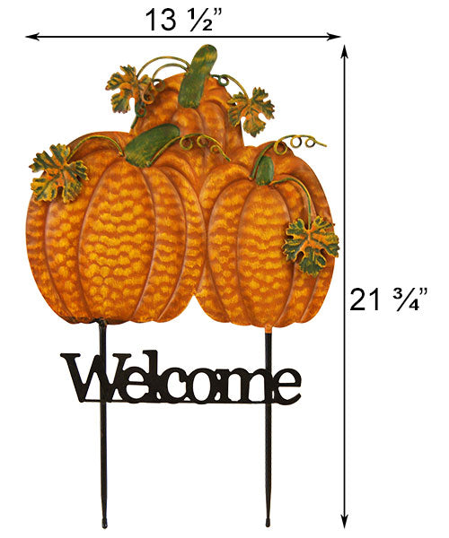 Enhance your lawn with autumnal style and an inviting message using this Land and Sea Metal Triple Pumpkins Welcome Yard Art. Made from lasting metal, this convenient, staked unit adds charm and color to your flowerbed all season. Three traditional pumpkin figures, grouped in a pyramidal shape, create a focal point, while impressed lines along each help define them. A green stem and a few, three dimensional tendrils extend outward from the pumpkins, contrasting the orange and yellow tones of the units and adding fantastic drama to the piece. The word "Welcome" sits horizontally beneath the gourds, and the black finish here contrasts your grass and plants. Two stakes help support this metal word, and their pointed bases insert easily into soil. The charming piece remains durable all season thanks to its all metal construction, and the vivid colors offer an inviting effect. Decorate your yard for your favorite season with this Metal Triple Pumpkins Welcome Yard Art.