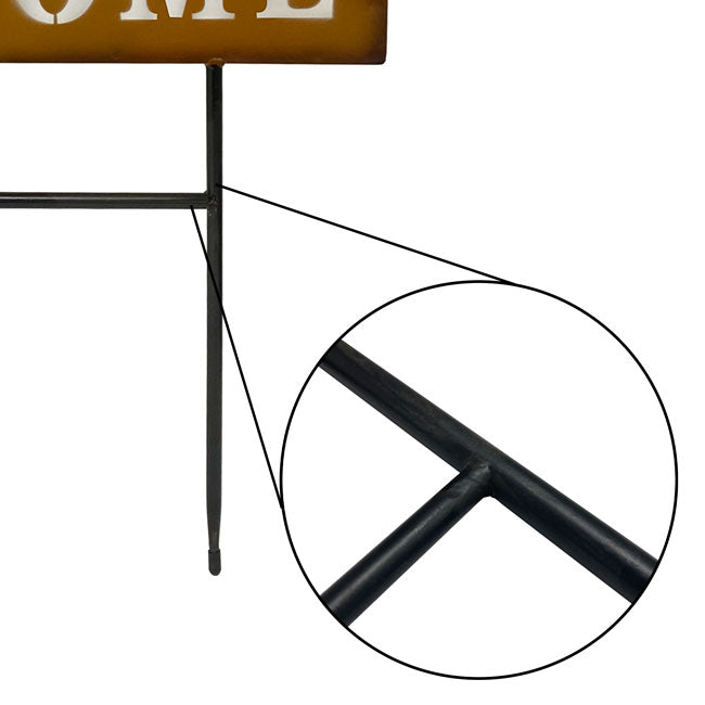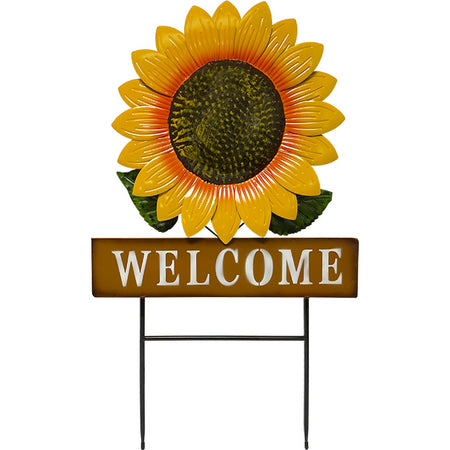 Mark your house as a cheerful place to visit when you add this Land and Sea Metal Welcome Sunflower Yard Art to your flowerbed. These familiar, well-loved flowers are often associated with happiness and optimism, and the vivid hues on this metal piece are sure to bring a joyful look to your landscaping. The single, large bloom with overlapping petals wonderfully mimics a sunflower, enhanced by a textured, brown center. Yellow dots within this disc accent its raised elements, and an orange to yellow gradient on each petal adds dimension. Dual, green leaves sit behind this large flower, with impressed vein shapes for a bit of realism. A rectangular plaque with the word "Welcome" in all caps sits below the colorful blossom, enhancing the cheerful effect. A horizontal, metal rod below this marker keeps the dual, 11" long legs stable, and their pointed ends insert easily into soil for a traditional display. Made of metal, this painted piece will remain vibrant in your lawn for many seasons, and its convenient size makes it great for placement in a flowerbed or large pot. Brighten your garden with cheerful sculpture using this Metal Welcome Sunflower Yard Art.