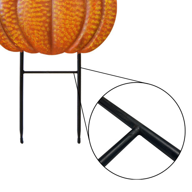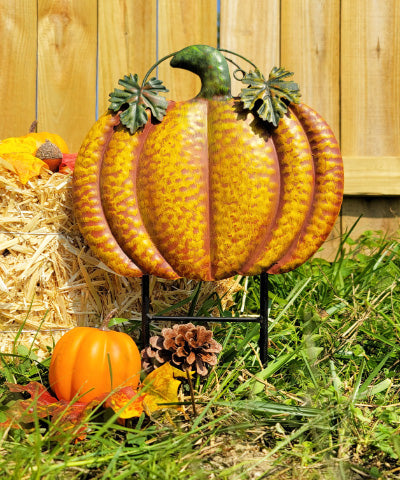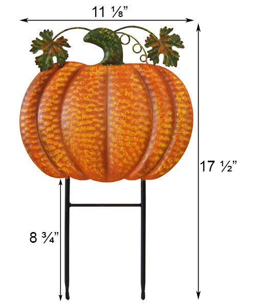 Add a festive element to your landscaping or in a large potted plant using this Land and Sea Small Classic Metal Pumpkin Yard Art. This compact and familiar gourd shape brings bright color to your home or sidewalk edge in moments, showcasing your love of fall for any garden visitors. Rounded sides and curved, impressed lines on the sculpture mimic a pumpkin, furthered by a green stem and two leaves. A spiraling tendril here adds both dimension and realism, while the orange, green, and yellow hues complement your fall foliage. Dual, 8.75" long legs extend from the base of this item, inserting easily into soil, and a cross beam between them adds strength and stability. Crafted from metal, this decoration is perfect for use for several autumns. Bring traditional fall style to your landscaping with this Small Classic Metal Pumpkin Yard Art.