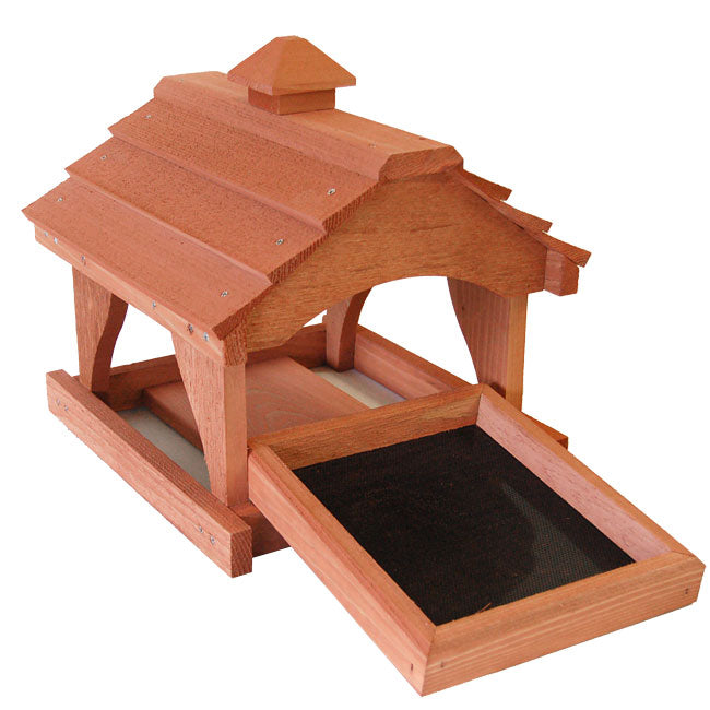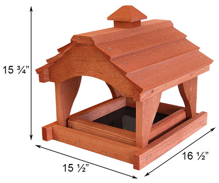 Showcase rustic style and your appreciation of birds in your yard with this Looker Products Pavilion Bird Feeder. The significant size and classic shape of this feeder add a wonderful look to any bird garden, while its cedar construction celebrates the natural world. The expansive, lapped roof shields the bottom seed tray from the elements, and a top cupola adds a bit of height and style to the unit. Four vertical supports extend from the rectangular base, handily holding the roof, and a 7.125" wide slat on the base of the piece accommodates a mounting bracket (not included) for post mounting it. A removable seed tray sits within this frame, and its plastic, screened base ensures feed remains dry. This platform holds 1.75 quarts of bird seed, suet cakes, or fruit, and the open sides of the frame invite a bevy of birds to dine. This section may also be removed for thorough cleaning and quick refilling, and the soft red hue throughout the item lends understated style. Its cedar body repels insects and rot naturally, and the open design welcomes a variety of birds to feast. Make a section of your yard a beautiful feeding spot for your feathered friends with this Pavilion Bird Feeder. Some assembly required. Made in the USA.
