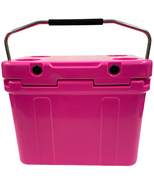 Keep food and beverages cold for a special day while proudly displaying your support for breast cancer awareness with this Mammoth Pink Cruiser Cooler by Prime Retreat. Spacious and vibrant, this robust item's vivid pink tone will allow you to exhibit your support and allyship during Breast Cancer Awareness month while also comfortably containing enough food or beverages for a large group of family and friends. This cooler holds up to 36 cans of your preferred beverage, making it an ideal choice for more lively gatherings requiring maximum capacity along with easy mobility. A built-in stainless steel hinge system lends this bright unit exceptional quality, and a sturdy, padded handle helps you easily transport the cooler, even with its generous capacity. Four non-skid, rubber feet on the item's underside provide extra stability and portability, letting you place the cooler on a table or a truck bed knowing it will remain steady. When you need to set your beverage down for just a moment, simply place your open vessel on one of the lid's four built-in can holders for ultimate convenience. Double-walled, rotomolded construction and a freezer grade lid gasket ensure your snacks remain chilled and your ice stays frozen for the duration of your party, while strong, rubber lid latches keep the item firmly closed and your snacks secure. A side drain unscrews in moments for times when excess water removal is needed, making maintenance a breeze. Use this rugged cooler to stow your favorite treats and drinks for your camping trip, hosting a backyard party, or tailgating with friends. Demonstrate your solidarity for breast cancer awareness and keep your hefty assortment of drinks and food fresh using the Pink Cruiser Cooler. Lifetime warranty.