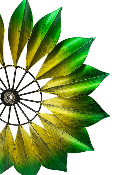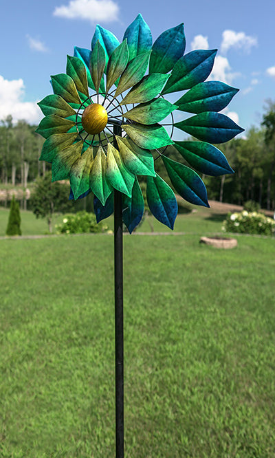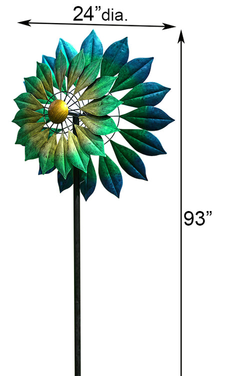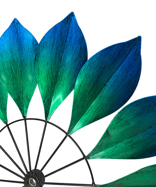 Add majestic height, bold color, and striking movement to your yard with this Marshall Blue and Green Kinetic Monterey Wind Spinner. The ombre finish on the dual toppers brings fantastic variation to any setting, and a clear coating on them reflects sunlight for extra drama. These leaf-inspired blades slightly angle and overlap to best capture wind, while bearings in the center hub move freely for a lovely spinning effect. A gold colored center disc, followed by yellow and green tones on the smaller, 15" diameter topper add a rich look to the piece, perfectly blending with the teal and royal blue colors on the larger, 24" diameter assembly. These discs affix easily to a center T post hub, and a tubular steel, three section pole completes the unit. Triple step-in bases on this post ensure a stable and lasting installation in your yard, and the black powder coating here adds durability. Its significant height and bright tones capture attention from some distance away, and the anchor provides versatile placement for just the right amount of movement. The tubular steel and metal construction is sure to remain hardy and beautiful for many seasons of service, and the varied topper sizes make a bold statement. Crown your landscaping with moving sculpture and remarkable color using this Blue and Green Kinetic Monterey Wind Spinner. Assembly required.