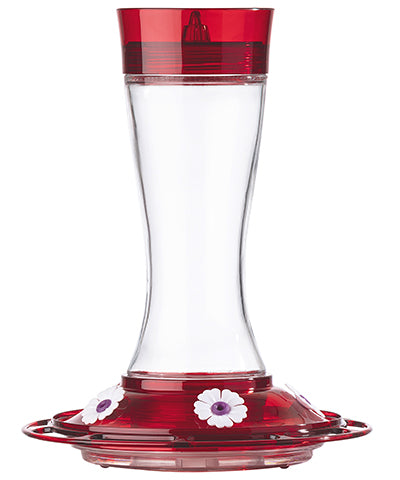 Adorn your landscaping with a striking feeder using the More Birds Garnet Hummingbird Feeder. The classic, tapered bottle on this feeder brings a wonderful look to your backyard, while providing plenty of nectar for hummingbirds. The clear glass reservoir keeps the 20 ounces of nectar visible at a glance, while the 5.5" diameter base has 5 feeding ports, for several birds to dine at once. A white and purple, plastic flower creates each port, and a plastic loop forms a perch for the birds to sit while dining. The bottle unscrews from the center of this saucer to refill it, and the base also disassembles for in-depth cleaning. The red cap on the bottle not only adds a cohesive look to the unit; it also may be filled with water to create an ant moat, stopping crawling insects from reaching the nectar. A plastic loop within this ant moat accommodates the included, metal "S" hook, for hanging the feeder in moments. The traditional, red and white hues add a timeless hint to the item, while its glass bottle creates a delicate feel. Bring classic shape and style to your bird garden with this Garnet Hummingbird Feeder.