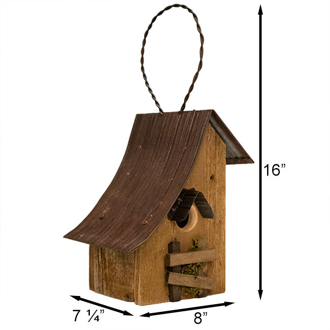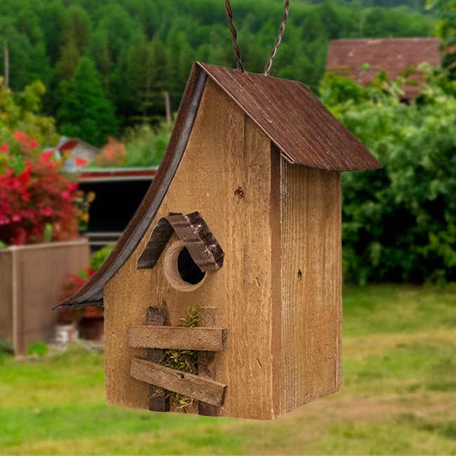 Add whimsy to your bird garden while celebrating authentic, timeless architecture from the American heartland with this Nature Creations Natural Kooky Chickadee Cottage. This handcrafted, quirky shelter adroitly recreates vintage heartland architecture, using upcycled materials from old midwestern barns and homes to create an entertaining and charming unit that will beckon birds to the garden while bringing a smile to your face. The faded and timeworn natural tone of the home's wood body sports a quaint and textured appearance, allowing you to showcase country elegance as this staunch dwelling houses wrens, chickadees, and various songbirds. A striking, pitched metal roof covers and protects the domicile, sloping dramatically downward to the left side of the home as it comes to a ridge slightly to the home's right side. An expansive loop of woven metal extends upward from this ridge, giving you an ample means for hanging the home from a branch or hook for an impressive display. Extensive care and detailing creates a rustic look, as the front of the abode features small wood boards and imitation greenery to create a fence motif just below the 1.25" entrance hole. This hole is guarded at the top and sides by a flat metal fixture, providing a safeguard against predatory behavior while songbirds can easily access the interior. To perform routine cleanings and check on the roost, simply remove the plastic cap from the back panel's 3" diameter hole to maintain a fresh and sanitary interior. For a different type of display, place this eccentric and offbeat house on a pole or post in your yard by attaching a mounting bracket (not included) to the sizable, flat base. This unique, one of a kind home gives you a fun and interesting accessory to show off in the garden, while harboring wrens and other songbirds safely in your yard. Alternatively, showcase the abode inside your house for a functional piece of decorative art. Provide songbirds an eco-friendly and entertaining roost in your yard with the odd and jovial joy of this Natural Kooky Chickadee Cottage. Handcrafted in the USA.