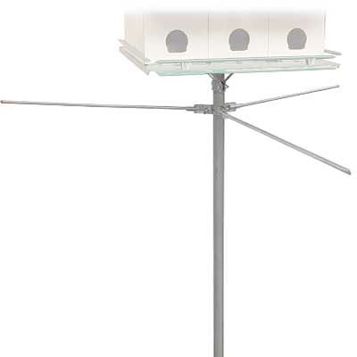 Provide plenty of perching spots to the purple martins in your area with this Nature House Purple Martin House Perch. This versatile assembly attaches to select Nature House martin house poles with ease, and each of the three arms extends 24" outward for a wealth of perching spots. The center hub is designed for use with the Nature House DuraCraft Purple Martin House Pole, the Nature House Martin House Pole, or attaches beneath a Trio Purple Martin Castle Safety System with a protruding house center tube. It can also fit onto other existing poles from 1.25" to 1.75" in outer diameter for versatility. The generous length of each rod enables martins to rest beneath the shelter and look upward at their nesting site, and multiples can be added for larger homes. The center brackets affix to the pole with wing nuts, for a straightforward assembly, and the metal construction offers durability. Create several perching areas in moments with this Purple Martin House Perch. Assembly required. Made in the USA.