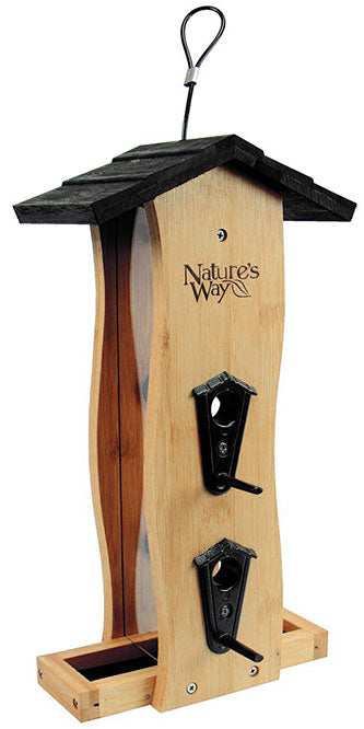 Highlight your love of aquatic style with this Nature's Way Bamboo Vertical Wave Hopper Bird Feeder. Slightly curved, upright bamboo panels create the undulating body of this feeder, bringing unique shape and style to your landscaping with ease. A rectangular base with metal tray and vertical plastic side panels completes the reservoir, accommodating 1.3 quarts of safflower, sunflower, or mixed seed. Four metal ports rest on the upright sides, and perches here create comfortable dining spots for larger birds. Additional seed exits the chamber via gaps, sitting on the perforated metal tray for even more dining spots. A ridge in the center of this metal panel creates a seed diverter, reducing build-up in the reservoir, and its screened material allows water to drain. The black, pitched and lapped roof further protects food from the elements, and slides up the attached, vinyl coated cable for easy cleaning and refilling. The bamboo construction of the shapely frame is naturally resistant to insects, bacteria, and squirrel damage, and the plant is quick to regrow and simple to harvest for a truly sustainable material. Beckon birds into your garden with this Bamboo Vertical Wave Hopper Bird Feeder. Ten year warranty.