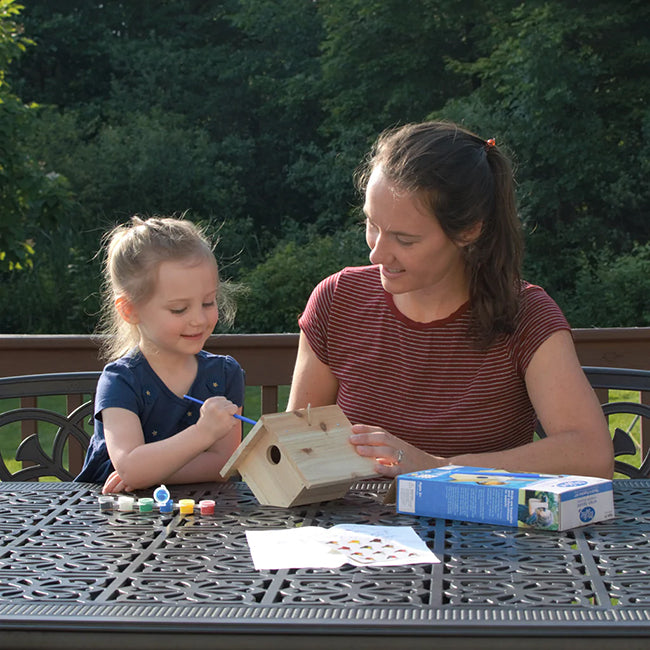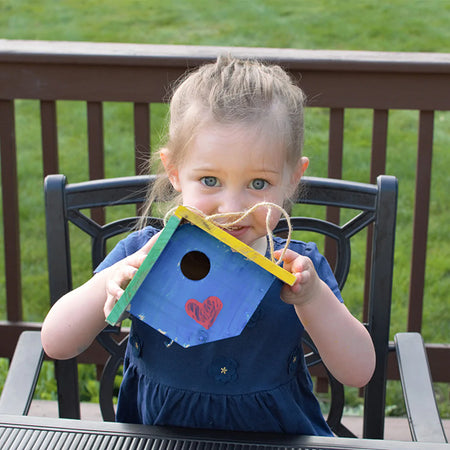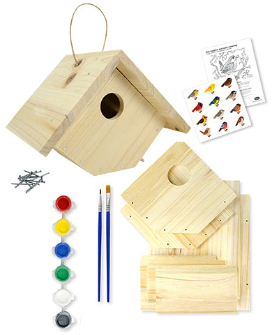Encourage your child to learn about the magnificent world of birding with this Nature's Way My First Wren House DIY Kit. Designed to be built as a project for parent and child together, this DIY kit is perfect for bonding with your child while you both discover exciting new things. Constructed using the included nails, seven pre-cut wooden panels and featuring a small entry hole on the front panel, this delightful shelter is ideal for wrens and chickadees and provides them a safe and cozy roost. Because these birds prefer shaded and sheltered environments, this house has the highest occupancy chances when hung using the included rope under the protection of hardy tree branches that are 5 to 10 feet above the ground. The sturdy, pitched roof overhangs the 1" diameter entry and ensures the inside of the house remains dry, although the entry hole should also be directed away from the usual direction of the rain. The house features a hinged panel with latch, allowing for you and your child to observe the teeny visitors as well as clean the piece, which should be done at least once a year and typically before nesting season in spring. The included instructions feature a fun coloring sheet, and the six included, differently-colored acrylic paints, two paintbrushes, and sticker sheet with various birds allow your child to decorate the house and stoke his or her artistic passion. Spend some quality time with your child and broaden her or his view of nature and construction with this My First Wren House DIY Kit. Assembly required.
