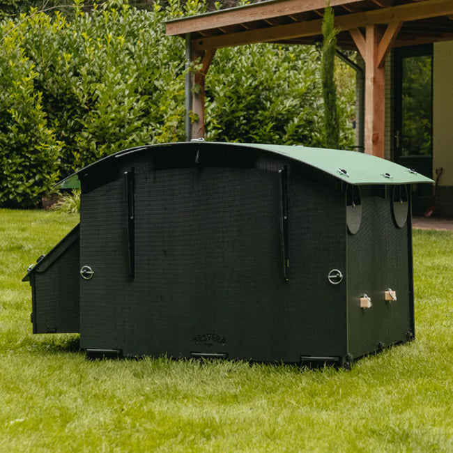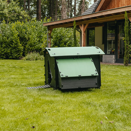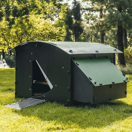 Provide your brood of chickens a durable and long-lasting roost with this Nestera Green and Black Large Chicken House. This freestanding, recycled plastic coop makes a perfect shelter for 8 to 15 hens, and its amazing features ensure both safety and comfort. A green, curved roof contrasts the black body of the home, which rests nicely on your soil for straightforward placement. The nesting area is divided into two equivalent compartments while its slanted roof lifts readily for egg collection. Dual wooden perches span the width of the shelter for several chickens to comfortably rest, and a 16.375" long ramp makes it easy for them to enter and exit the haven. The sliding metal door can be propped open during the day and securely latched at night for protection from predators. The home's back wall removes for thorough seasonal cleaning and maintenance, and the compact footprint makes placement easy. The 0.5" thick, recycled plastic construction provides fantastic durability while remaining environmentally sound, and the black color offers superior insulation. Dual, adjustable vents further regulate the internal temperature, and the green hue of the roof matches with your foliage. Establish a thoughtful, lasting shelter for your backyard chickens with this Green and Black Large Chicken House. Assembly required. Twenty five year warranty.