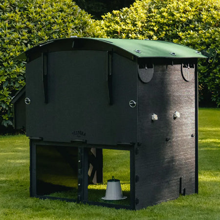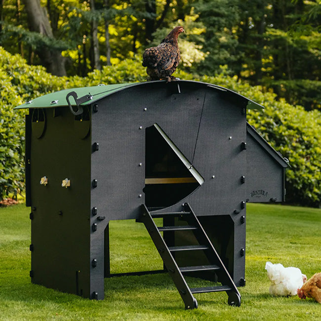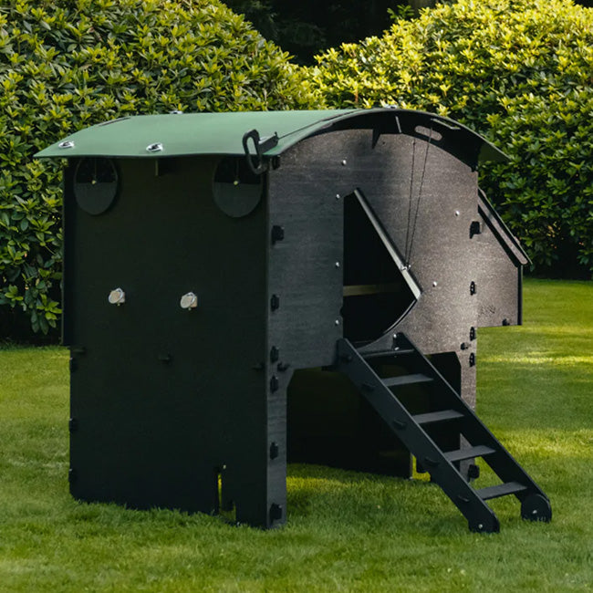 Introduce a durable and comfortable chicken roost to your backyard with the Nestera Green and Black Large Raised Chicken Coop. The black finish of this coop is accentuated by its arched green roof and the nesting box's matching, slanted roof, all made entirely of UV-resistant recycled plastic. The larger cubic footprint of this coop provides plenty of space, accommodating between eight and fifteen hens. The home stands 9" off the ground, providing easy access to cleaning and egg collection, as well as offering space below for feeding and shelter. A 25" long ladder gives hens access to their new home while the coop's nearly 0.5" thick, recycled plastic construction offers safety from weather, mites, and predators. The adjustable ventilation and superior thermal insulation add comfort to this home's value, and the removable rear hatches and roofs make for simple access for cleaning and egg collection. A sliding metal door forms a secure entrance to the coop, helping prevent access by predators. This structure provides a safe, weatherable, and practical roosting and feeding spot for hens to thrive, and wheels (not included) can be added for even more versatility. Offer your backyard chickens a lasting haven by adding this Green and Black Large Raised Chicken Coop to your yard. Assembly required. Twenty five year warranty.