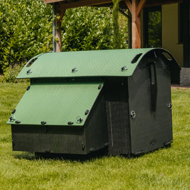 Provide your flock of chickens an enduring and reliable roost with this Nestera Green and Black Medium Chicken House. This freestanding, recycled plastic coop makes a perfect shelter for 5 to 9 hens, with a green, curved roof and slanted nesting box contrasting the black complexion of the home. A pair of wooden perches spans the width of the abode for multiple chickens to comfortably rest, while a grooved ramp creates a simple entrance and exit for your fowl. The sliding metal door can be propped open during the day and securely latched at night to protect against foxes and other marauding predators. Remove the habitat's back wall for thorough maintenance and seasonal cleaning of this compact, attractive unit. The nearly 0.5" thick, recycled plastic construction gives superior durability while remaining environmentally sound, and the thermal insulation ensures your flock will stay safe against the threat of outdoor elements. Dual, adjustable vents further regulate the interior temperature, and using this unit is easy; simply place this quaint home on level ground for easy function. Create a durable, comfortable home for your backyard chickens with this Green and Black Medium Chicken House. Assembly required. Twenty five year warranty.
