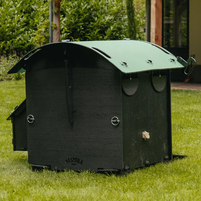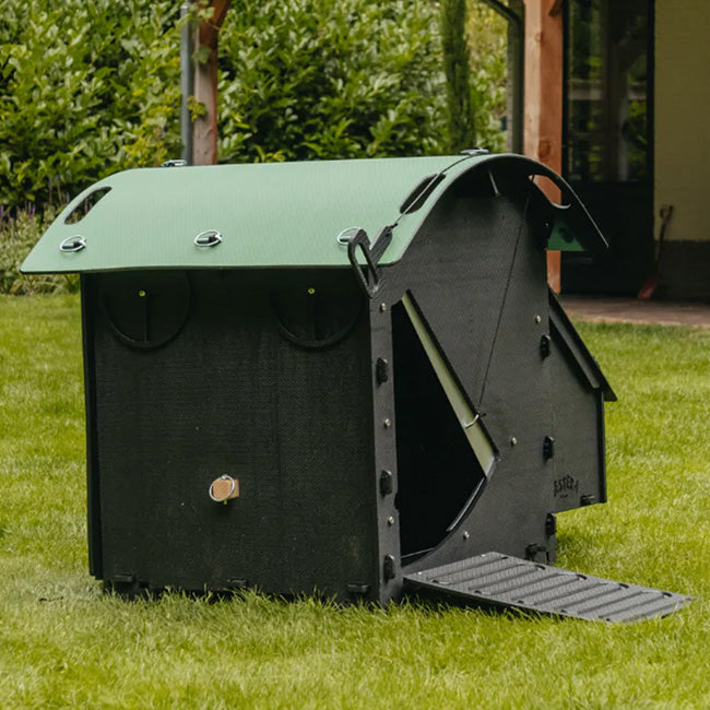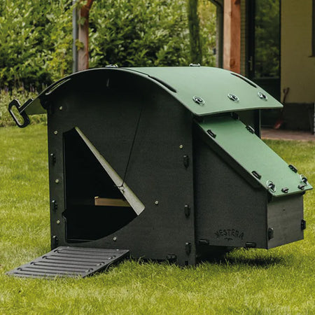 Provide your small flock of chickens a durable and classic nesting site with this Nestera Green and Black Small Chicken House. This freestanding, recycled plastic coop makes a perfect shelter for 3 to 5 hens, and its amazing features ensure both safety and comfort. A green, curved roof contrasts the black body of the home, which rests nicely on your soil for straightforward placement. The nesting area extends 14" outward from the side of the coop, and its slanted roof lifts readily for egg collection. A wooden perch spans the width of the shelter, for chickens to comfortably rest, and a 16.375" long ramp makes it easy for them to enter and exit the haven. The sliding metal door can be propped open during the day, and securely latches at night for protection from predators. The home's back wall removes for thorough seasonal cleaning and maintenance, and the compact footprint makes placement easy. The 0.5" thick, recycled plastic construction provides fantastic durability while remaining environmentally sound, and the black color offers superior insulation. Dual, adjustable vents further regulate the internal temperature, and the green hue of the roof matches with your foliage. Establish a thoughtful, lasting shelter for your backyard chickens with this Green and Black Small Chicken House. Assembly required. Twenty five year warranty.