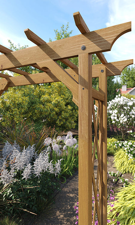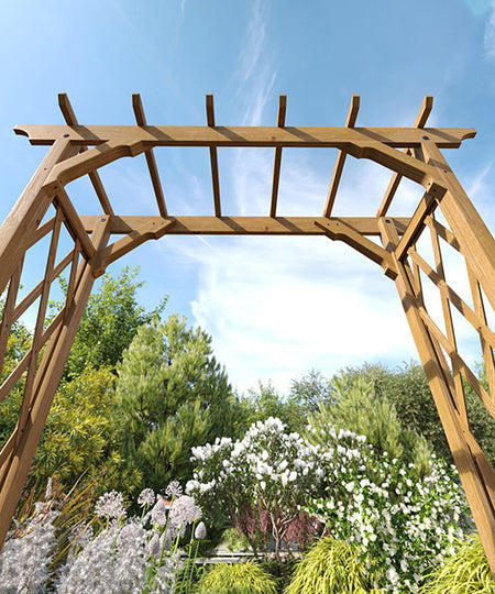 Create a delightful entryway to your garden with this New England Brown Cedar Heartwood Arbor. Using an arbor on your garden threshold forms a unique passageway, helping you alter your mindset into a calming state. The flat top and intersecting slats of this cedar unit lend it a sleek silhouette, furthered by the diamond shaped lattice on the two side panels. This not only brings a dazzling effect to your yard; it also provides climbing plants gripping spots for added dimension. A water based, environmentally friendly stain creates the soft, brown hue on the piece, while the cedar construction naturally repels insects and rot. Made from sustainably sourced, FSC cedar, the structure is sure to withstand use and display for many seasons, highlighted by its natural grain, knots, and hue. Attach the included metal stakes to each vertical post, to keep the unit stable when placed in your soil. The lovely, rectangular shape and extended sides provide plenty of room for walking beneath it, and the top rafters handily capture attention. Showcase your garden path easily using this Brown Cedar Heartwood Arbor. Assembly required. One year warranty.