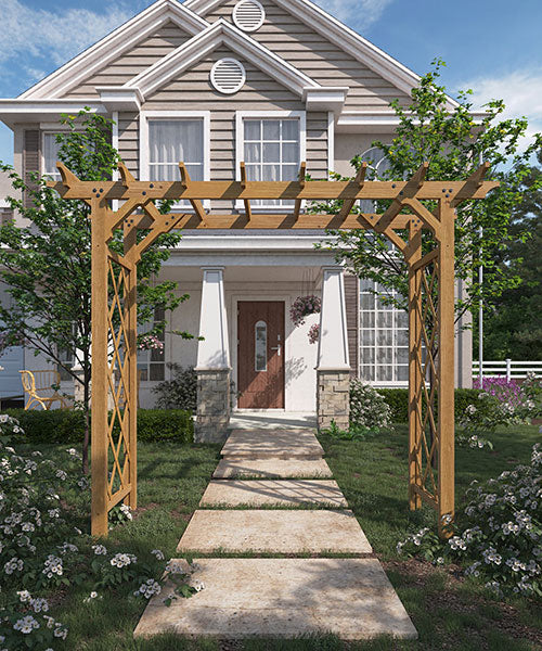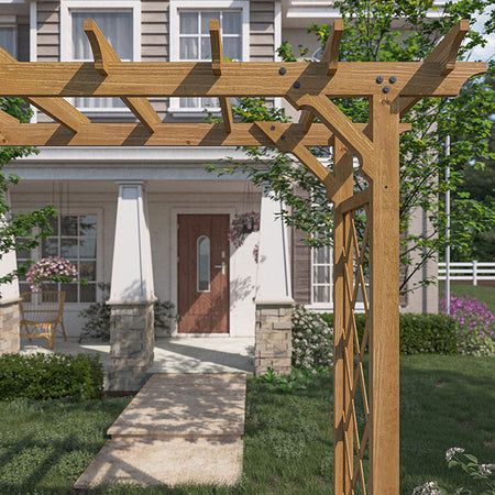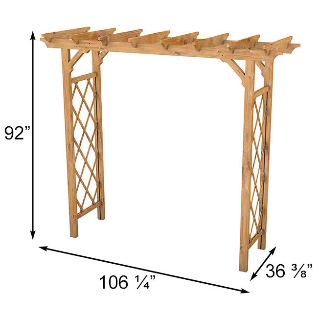 Turn your sidewalk or garden entry into a focal point easily with this New England Brown Cedar Heartwood Grande Arbor. This extra wide, flat topped unit transforms your outdoor space into a welcoming gathering spot, while the cedar body and brown hues enhance your landscaping. Upright side panels with a diamond shaped lattice not only support the generous, horizontal beams; the large, open shapes provide plenty of gripping spots and growing room for flowers or climbing ivy. Additional cedar slats over the top of the unit create a bit of shade and form the passageway effect, and slightly curved ends on them offer a touch of elegance. Made from sustainably sourced, FSC cedar, this arbor brings an environmentally sound look to your yard, and the slight variations throughout the wood regarding its grain and any knots enhance its natural construction. A water based, environmentally friendly stain augments the brown tones, and the cedar lumber naturally repels rot and insect damage. Affix the included, metal stakes to the upright posts, for a stable installation in soil. The significant opening is great for spanning large walkways or creating a lovely garden entry, and the straight lines throughout it contrast the shapely blooms of your flowers. Create a bold garden statement in moments using this Brown Cedar Heartwood Grande Arbor. Assembly required. One year warranty.