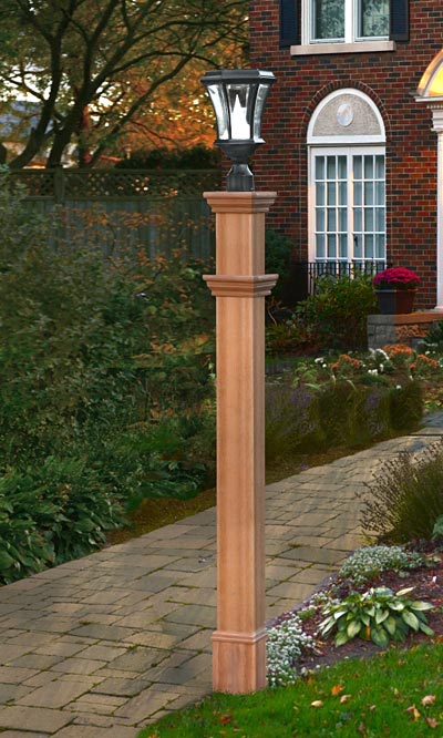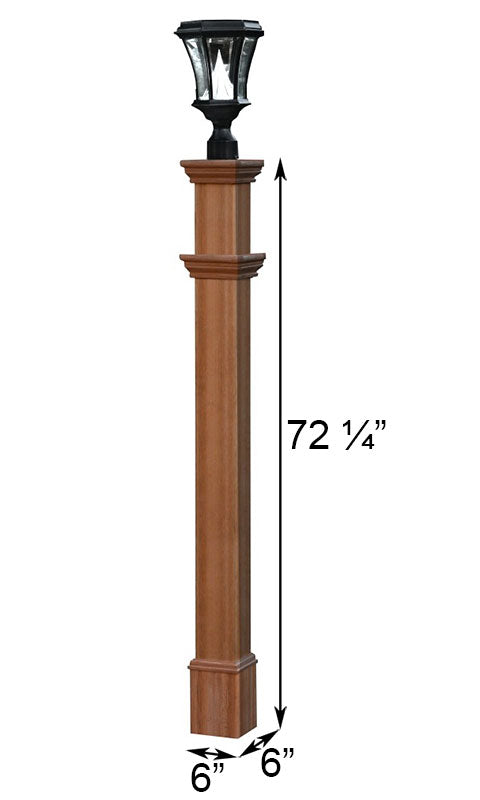 Evoke timeless materials and style in your yard using the New England Charleston Lamp Post. This unique stand elevates your existing outdoor lamp, while its tan color and detailed collars add a classic touch. The 6" square base supports the post, and a collar completes the 8.5" tall bottom section. The stand then tapers to a 5" square, with two additional stepped moldings near the top for added design. A 3" diameter collar at the top of this post accommodates your existing solar or electric outdoor lamp (not included), and the 72.25" height keeps the light visible. Insert a wooden 4 x 4 post (not included) inside this hollow post to securely install it in your yard. The innovative, recycled wood pulp and vinyl blend body offers the durability and maintenance-free perks of vinyl to the piece, as well as the look and texture of wood. Create style and add light to your front yard using this Charleston Lamp Post. Ten year warranty.