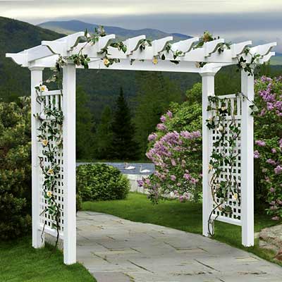 Add an impressive structure with designer style to your yard using the New England Fairfield Grande Arbor. This flat, pergola-style arbor lends a touch of the eastern seaboard to your garden, with its bold white color and vinyl construction. The square legs are spaced quite a distance apart, for a rectangular frame capable of spanning a wide walkway. The top of the unit is covered with horizontal slats, each with a slightly pointed end for extra angles. A section of vertical rods at the top of each side panel helps heighten the unit, with square lattice beneath that to complete the sides. Add color to this arbor by training your climbing plants to wind through the lattice as they grow, for blooms in unexpected places. Also, situate hanging baskets at the top of the item for a hanging garden. The lasting, vinyl construction easily withstands use for several seasons while providing quality and durability. Place the sturdy feet of the unit flat on the ground, or slide a 4 x 4 post (not included) into each leg to anchor the piece firmly. Make a dramatic statement in your garden with this Fairfield Grande Arbor. Assembly required. Twenty year warranty.