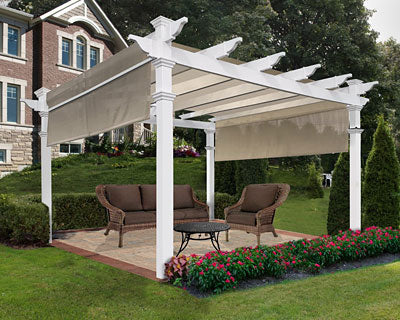 Turn a section of your backyard into a lovely, outdoor room using this New England Monterey Pergola. This generous structure creates a fantastic, shaded area in your backyard, perfect for placing above a few chairs or a picnic table. The four, white vinyl posts create a wonderful, square shape for your seating area, and each sports a pointed endcap and dual, stepped trim for drama. These 5" square legs support the significant, top rafters, creating a 144 square foot retreat. Extended, ornate caps complete each rafter, and the included, canvas shade spans the top for a comfortable resting spot. Two included retainer bars keep the shade in place, and its canvas construction remains durable. The soft, tan color and dynamic weave allow light to penetrate the cover but not overwhelm the area, ensuring a fantastic, shaded garden setting. The vinyl construction of the frame will not warp, yellow, or rot, and retains its crisp white color for many seasons with little maintenance. Place this unit in your landscaping or on a level surface, for a wealth of display options. The hollow legs each accommodate a wooden 4 x 4 post (not included) for installation in soil, or New England Bolt Down Brackets (not included) can be used for placement on a deck or patio. Enhance your backyard with fantastic height and a shady resting area with this Monterey Pergola. Assembly required. Twenty year warranty.