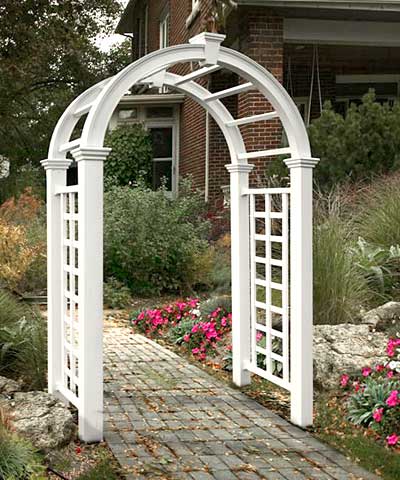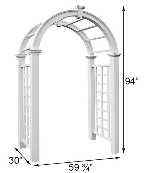 Bring stunning architecture to your garden with the New England Nantucket Deluxe Arbor. This romantic structure will surely inspire you and any visitors to your yard. The significant arch lends a classic look to the item, with square gridwork on the side panels for added design. Horizontal bars at the top of the item help support the arch, and a keystone detail completes the effect. The square legs easily span a sidewalk, for a dramatic entry into the yard, and the grid on the side panels echoes the leg shape. Create a custom look on your arbor by adding a gate or fencing (not included), or train your climbing plants to weave in and out of the side panels for exciting color and patterns. Made from high grade, long lasting vinyl, this arbor will provide beauty and excitement for years to come. The white color keeps it looking new and vibrant, while the vinyl will never fade or peel. Add a touch of romance to your yard with this Nantucket Deluxe Arbor. Assembly required. Twenty year guarantee.