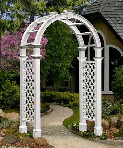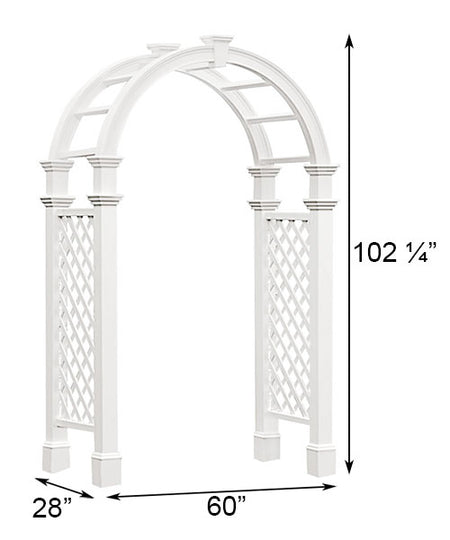 Add an architectural and ornate entry to your garden with the New England Nantucket Legacy Arbor with Trim. This romantic structure will certainly bring an inspiring hint to your yard, thanks to its white color, diamond-shaped lattice, and soft arch. Its shape lends a familiar silhouette to your garden, and the square, upright posts offer both stability and height. A flared molding at the base of each leg, along with dual trim caps at the top, enhances your backyard adornments, and the diamond-shape lattice on each side panel lends a classic touch. Horizontal bars help support the top arch, and a keystone detail here creates a focal point. Made from high grade, long lasting vinyl, this arbor will provide beauty and excitement for years to come. The white color keeps it looking new and vibrant, while the vinyl will never yellow, rot, or warp. Place a wooden 4 x 4 post (not included) into each leg to securely install it in soil, or use New England Surface Mounts (not included) to display this unit on a level surface. Bring a splendid look to your garden using this Nantucket Legacy Arbor with Trim. Assembly required. Twenty year guarantee.