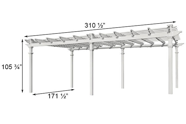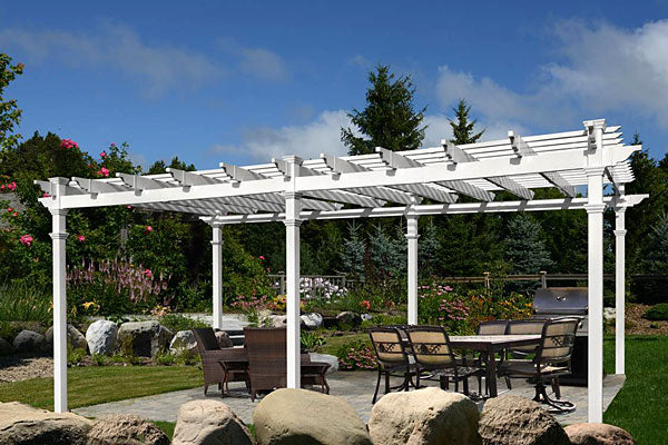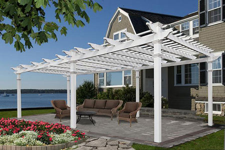 Create a palatial gathering spot in your backyard using this New England Regency Grande Pergola. This generous structure is certain to turn a bit of your yard into an outdoor room, thanks to its significant, flat top and ornate detailing. Its six rectangular uprights support the impressive roof, which handily covers over 250 square feet for a fantastic outdoor retreat. Trim pieces at the top and base of each 5" square post further the majestic feel, and a wealth of rafters and slats create plenty of shade. Additional curved pieces complete these top rafters, and the unit can easily accommodate one or two New England Canvas Weaves (not included) for extra comfort. The vivid, white hue of this item certainly captures attention, and its vinyl construction remains durable for many seasons. Periodically rinse the pergola with a garden hose to retain its crisp color, and add a New England Garden Bed (not included) or New England Flat Top Privacy Screen (not included) to the 12' end to divide your garden. The hollow, vinyl legs of this unit may be installed in soil using 4 x 4 posts (not included), or may be placed on a wood or concrete surface using New England Bolt Down Brackets (not included). The robust vinyl body will not crack, peel, warp, or yellow, and the size and accessory options create a truly versatile accent. Enhance your garden with a royal structure using this Regency Grande Pergola. Assembly required. Twenty year warranty.