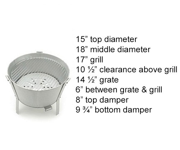 Add a fantastic grilling experience to your small outdoor gathering with this Old Smokey Medium Classic Barbecue Grill. This compact, portable grill is a perfect addition to your family beach day or tailgate, with enough cooking space to create a delicious feast for 4 to 6 people. The aluminized steel body forms a lasting instrument, and 3 legs easily attach to it for height and plenty of air flow. The tapered base holds a great amount of charcoal on its perforated, 14.5" diameter bottom grate, and a 17" diameter, classic grilling grate sits above this to accommodate your brats, metts, or vegetables. A generous lid fully covers the food, helping give it that distinct, grilled taste, and dampers on the lid and base aid in regulating the heat and smoke level. A top handle makes it simple to remove the lid for checking food or adding more fuel, and the steel body encourages even heating and quick cooking. Its silver color brings a classic look to your party, while the lightweight body makes transporting this item easy. Grill a fresh, fun meal for your next outdoor party on this Medium Classic Barbecue Grill. Assembly required. Made in the USA. Two year limited warranty.