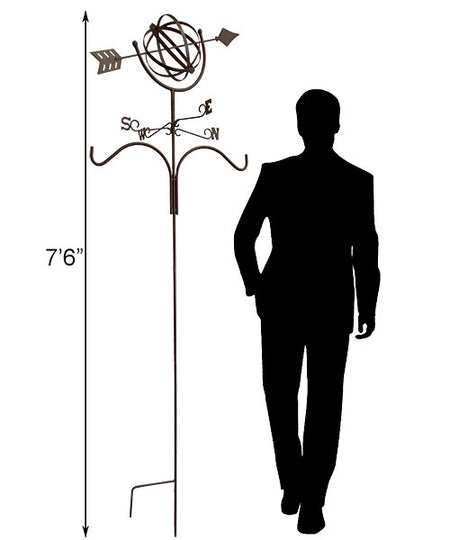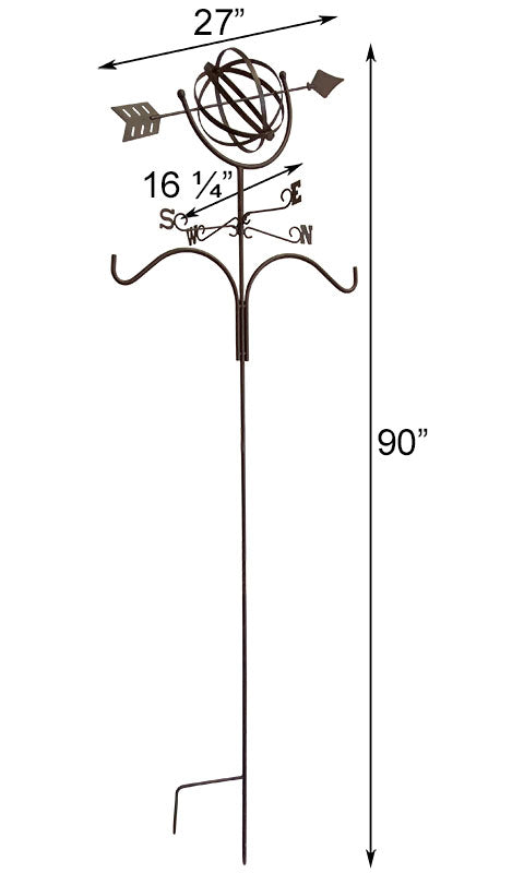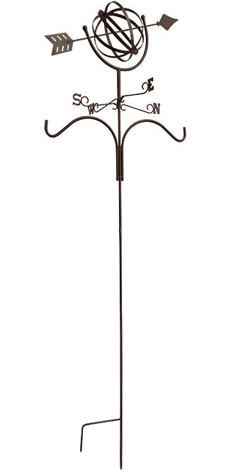 Celebrate timeless weather instruments in a unique way using this Panacea Armillary Weathervane Double Shepherd Hook. Ornate, top detailing on this robust hanger brings both height and exemplary style to the item, while evoking antique instruments. Quadruple rings on the top of the steel shaft spread outward to create an open sphere, with an arrow running through it to form a classic armillary. A semicircular rod cradles this orb and arrow, with a small ball on each end of it furthering the motif. Classic directionals rest below this top accent, perfectly mimicking a weathervane, and a thumbscrew here allows you to properly orient them. Dual hooks arc outward below this detailed top, culminating in an upward curl to support hanging items up to 21" in diameter. A straight, center shaft supports both these hangers, and a 6" long, step-in base helps anchor the item in your soil. The brown tone throughout the hook offers a rustic look while meshing with your garden, and the strong steel construction lasts for many seasons. Bring antique décor to your birding hobby, along with rustic colors and materials, with this Armillary Weathervane Double Shepherd Hook. Some assembly required.