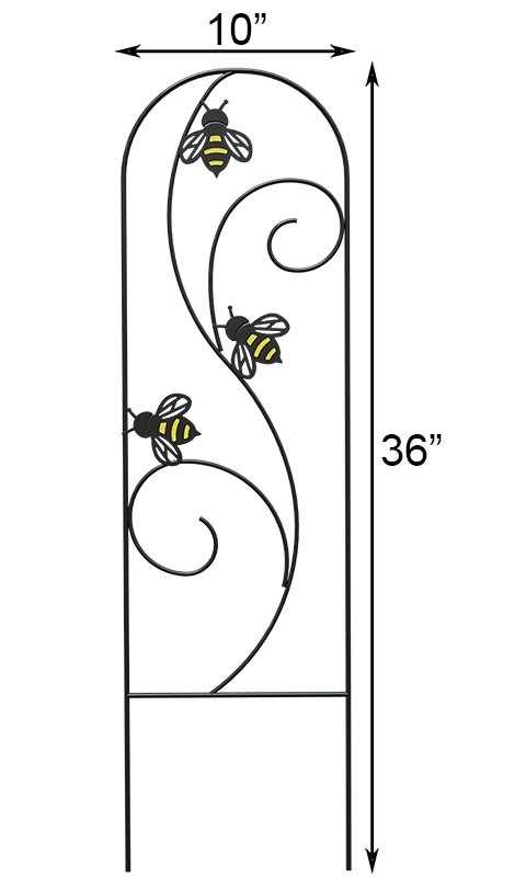 Foster upward growth of your favorite, bee-friendly plant using this Panacea Black Bee-Conscious Pot Trellis. Three adorable, recognizable bee figures adorn the interior of this arched trellis, adding both color and a bit of whimsy to your potted plant with ease. Yellow stripes on each black, metal figure not only provide definition; this also showcases your love of these pollinators. Providing these insects with their favorite flowers and other plants helps them thrive, and can also help curb their population decline. Round, metal rods extend upward from the trellis' lower, horizontal rod, and curl and curve to wonderfully evoke tendrils. This offers gripping spots for vines, helping them grow upward, and the two, 7.5" long legs insert easily into soil. The 10" width of this item makes it perfect for use in large pots, while the black finish and yellow hints add a bold look. Support both a climbing plant and pollinating insects with this Black Bee-Conscious Pot Trellis.