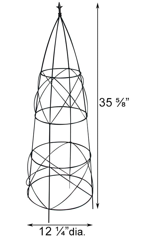 Bring sculpture and function to your garden or potted plants with the Panacea Circular Obelisk with Finial. Four rings, decreasing in diameter from 11.125" to 5.75", create stability for the four legs of this item. Thin, round metal rods swirl and cross between the two topmost rings and two bottom rings for a bit of interest and additional support for your plant. A fleur-de-lis finial shape tops the unit, lending a classic element to the piece. Place the four legs into the soil above your young plant, and weave it through the rods as it grows. This helps the plant grow upright, and keeps the root system healthy. The black color accents any plant, while the metal construction withstands the elements. Keep your climbing plants growing upright using this Circular Obelisk with Finial. Made in the USA.