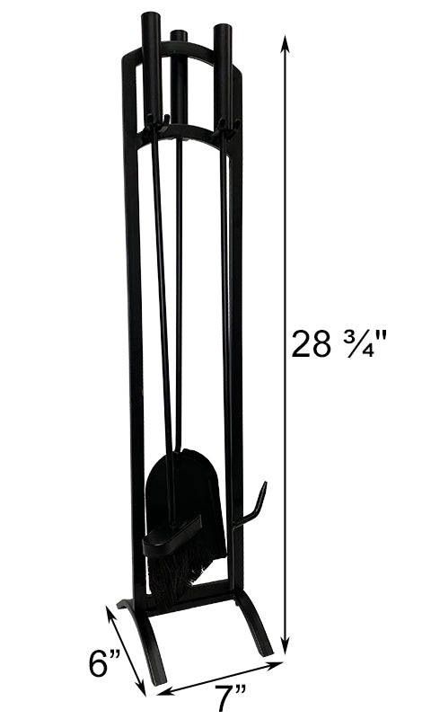 Keep yourself safely distanced while attending to the flames in your fire box with this Panacea Black Classic Fireplace Tool Set. Placing this sleek stand and included fire tools next to your hearth makes it simple to tend to the flames, safely adding or repositioning logs as necessary using the included poker. An included brush and shovel aid in cleaning ash and debris once the fire is extinguished, and the steel frame perfectly holds these accessories. An arched top and dual curved legs on this holder mesh with the cylindrical handle of each tool, while the black finish blends with many motifs. The arched legs not only offer height to the stand; they also contrast the rectangular frame and rest easily on a level surface. Made from hardy steel, the tool set provides several seasons of use, and wonderfully accents virtually any home fireplace. Tend to your fire and keep the area tidy with help from this Black Classic Fireplace Tool Set. Some assembly required.