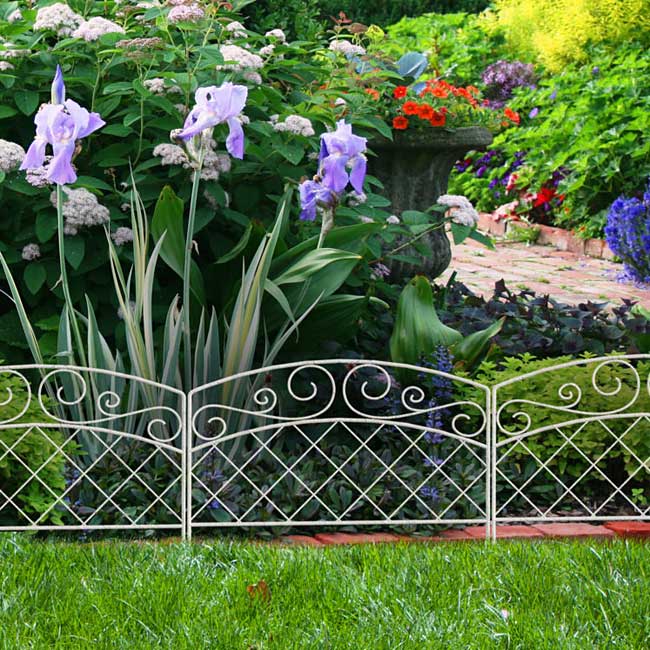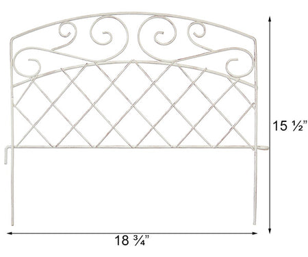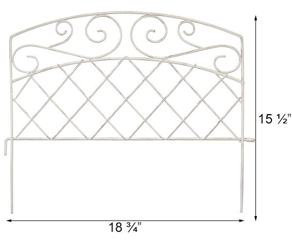 Bring a charming, antique look to your garden pathway or landscaping with the Panacea French Country Scroll Border Fence. This decorative edging forms a wonderful border along your driveway or sidewalk, for a unique and orderly look throughout your yard. The gently arched top and varied scroll shapes lend a delicate look to the unit, enhanced by its distressed white finish. A diamond shaped lattice beneath the arch brings both structure and style to the fence, and a horizontal rod creates a finished look. This rod also sports an "L" bracket on one side and eyehook on the other, for interlocking each piece of fencing. Two 5.75" long legs extend from this rod as well, making installation into your soil simple. The distressed finish throughout the fence adds a classic hint to your backyard, and the all metal construction will look great year after year. Line your garden path with a touch of European style using this French Country Scroll Border Fence.