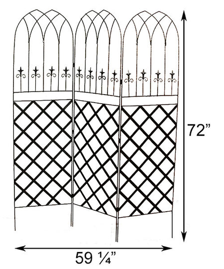 Add timeless beauty to your garden with the Panacea Gothic Garden Screen with Lattice. This three paneled screen has lattice work covering the lower section, and each top section features double gothic points. Small spires on each panel top the latticework, and evoke a fleur de lis. This screen installs in the ground easily to create a backyard partition or to camouflage an unsightly appliance. Plant flowers and vines around this screen and weave it through the lattice for a piece of living art. The black color blends into most surroundings, and the metal construction can withstand harsh weather for several seasons. Add the Gothic Garden Screen with Lattice to your yard for a dynamic and functional ornament.