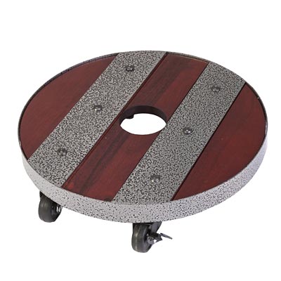 Elevate your potted plant with new style and strength on this Panacea Wood Industrial Round Plant Caddy. Using a caddy or trivet beneath your plant keeps its base off of the cold ground, helping roots remain warm and providing drainage. This durable unit is perfect for holding planters up to 11" in diameter at the base, and its sleek design offers bold style. A lasting, wooden body handily holds your planter, and a metal band surrounds it for a finished look. Two metal slats flank the 2.25" diameter, center opening, and the speckled gray hue of the metal furthers the industrial theme. A reddish stain on the wood protects the body from the elements, and four wheels make it simple to reposition your plant. Two of the wheels lock, preventing the caddy from moving, and their metal and plastic construction are sure to remain strong. Help your favorite potted plant drain and grow well by placing it on this Wood Industrial Round Plant Caddy.