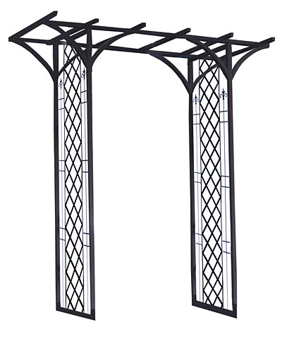 Let the Panacea Lattice Arbor transport you into a quaint country garden. The classic style of this metal arbor will surely make a grand statement as guests pass through to your yard. The rectangular roof and panels lend a contemporary feel, perfectly juxtaposed with the timeless latticework. This arbor is ideal for supporting vines, climbing plants, or for hanging your decorative items. Simply train your plants by weaving them in and out of the arbor to create your own unique, dynamic design. The steel construction will withstand even the harshest climates, and its black, powder coated finish will enhance any décor. The Lattice Arbor will add beauty and charm to your yard, year after year. Assembly required.