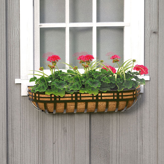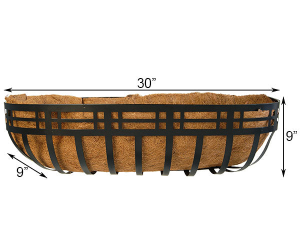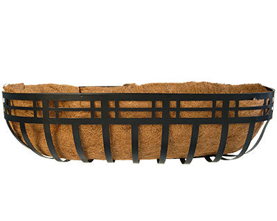 Boldly showcase a few plants along with your favorite style of architecture using this Panacea Black Mission Deck Planter Box. A rectangular grid at the top of the unit creates the Mission motif, crafted from flat, steel slats for a hardy planter. Additional, vertical slats curve inward to create the base of the piece, and a coco fiber liner rests inside this frame. This helps keep soil nicely contained in the unit, and forms a 29" long planting bed for flowers or herbs. Keyhole openings on the back of the item make it easy to affix it to a wall or other flat, vertical surface, and the powder coated finish protects the unit from the elements. Add architectural planting area to your home or patio with this Black Mission Deck Planter Box.